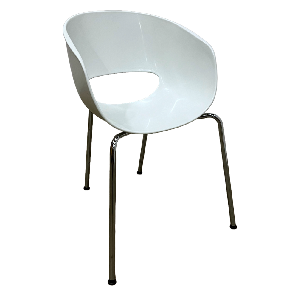 Stol med vit sits i plast och kromat underrede